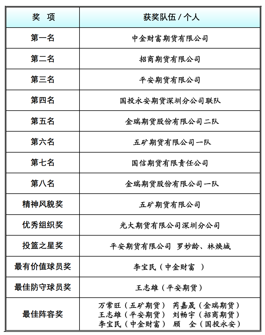 经过多轮角逐,中金财富期货有限公司凭借稳定的发挥脱颖而出,最终夺得本届赛事冠军;招商期货有限公司通过良好的团队协作获得亚军,展现了作为主办方沉着稳健的竞赛态度;平安期货有限公司获得赛事季军,同时打破“投篮之星”趣味赛历史纪录,为赛事一大亮点。